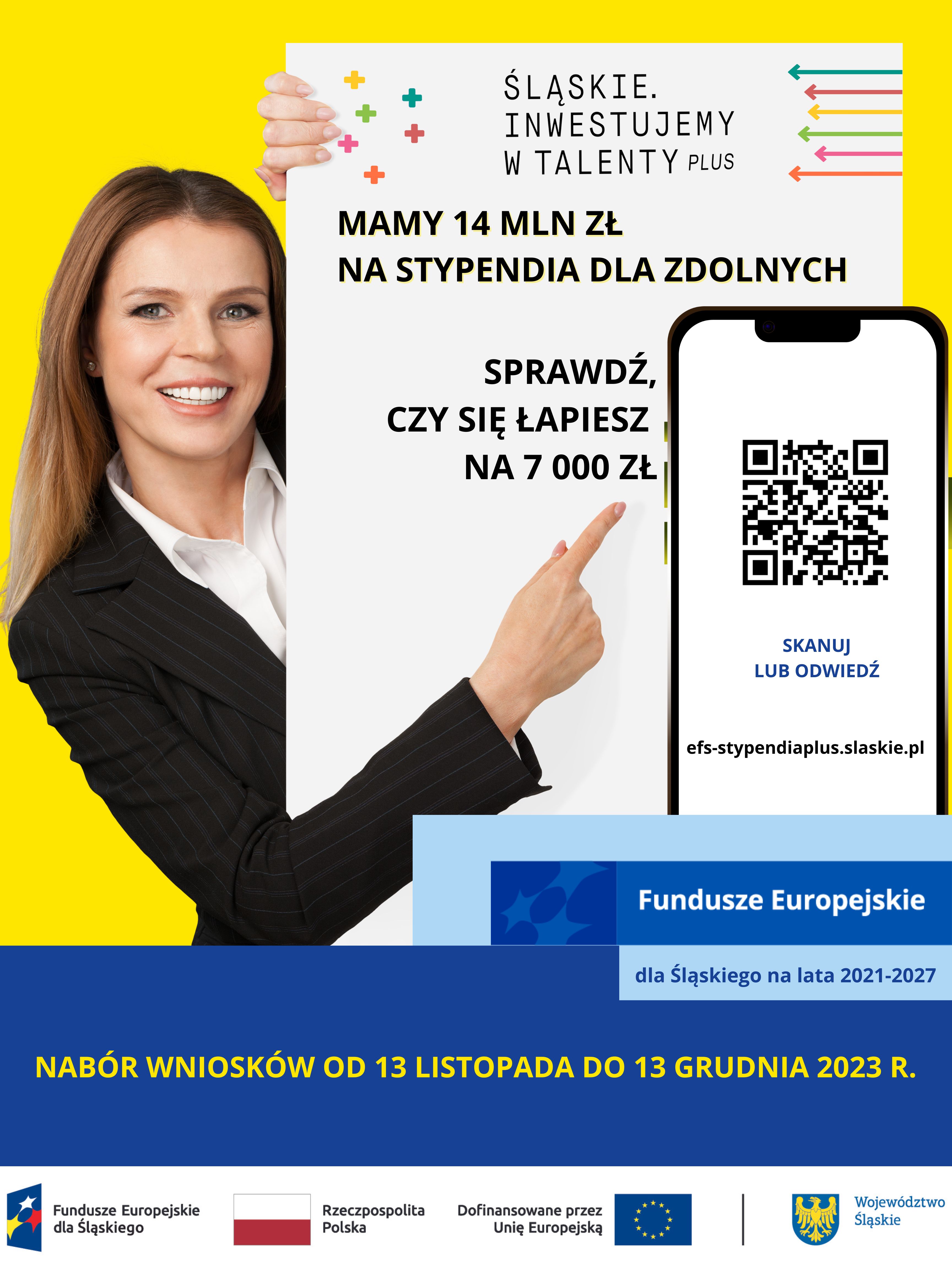 uprzejmie informuję, iż od 13 listopada 2023 roku, trwa nabór wniosków o przyznanie stypendium w ramach nowego projektu „Śląskie. Inwestujemy w talenty PLUS - I edycja”, realizowanego przez Województwo Śląskie w ramach Programu Fundusze Europejskie dla Śląskiego 2021 – 2027.
