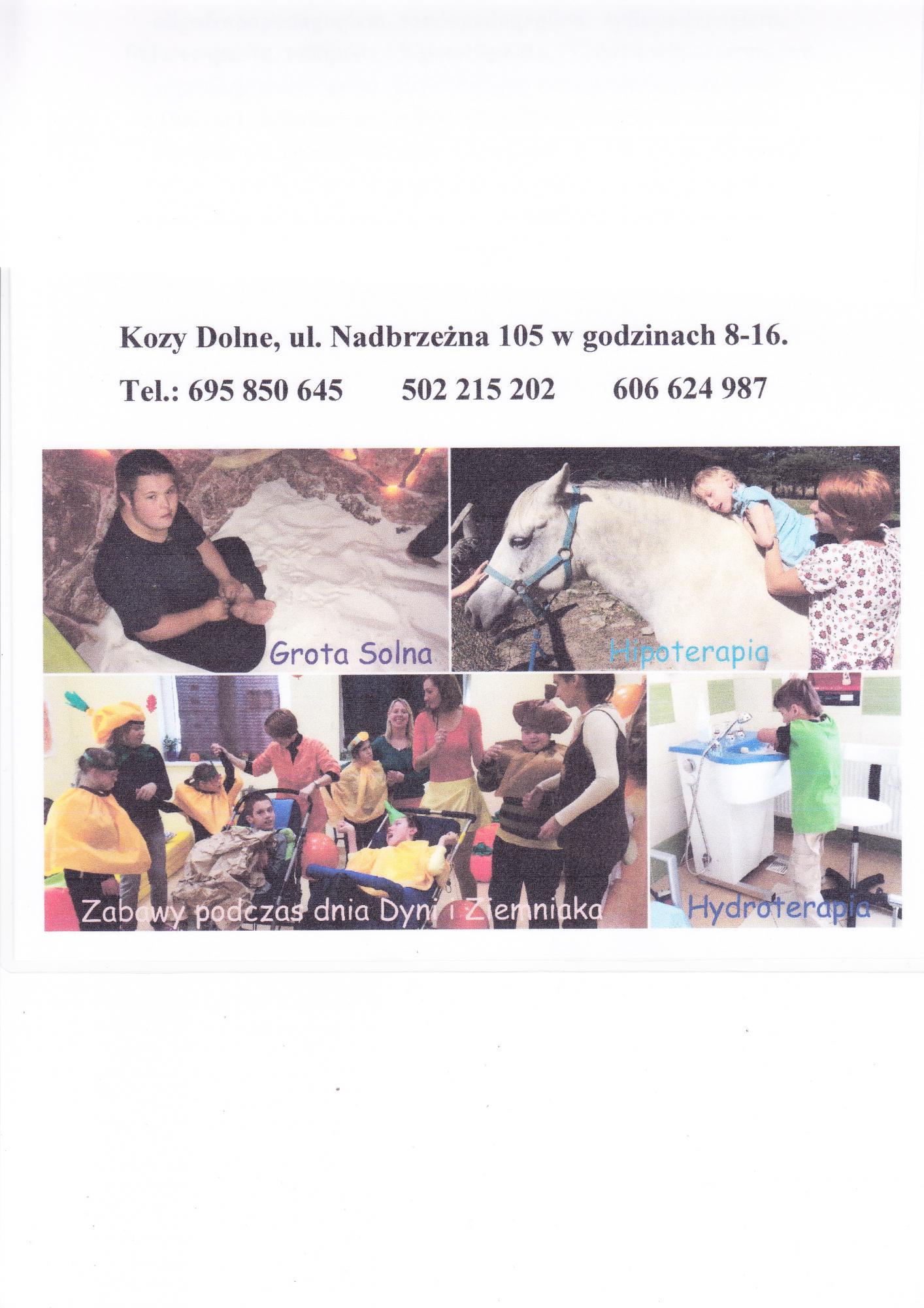 "Nowopowstały ośrodek dla dzieci z niepełnosprawnością intelektualną w stopniu głębokim oraz umiarkowanym i znacznym ze sprzężeniami, przyjmie dzieci w wieku od 3 do 25 lat. W Ośrodku bezpłatnie mogą realizować obowiązek szkolny oraz uczestniczyć w zajęciach i konsultacjach specjalistycznych z: psychologiem, logopedą, oligofrenopedagogiem, surdopedagogiem, tyflopedagogiem, fizjoterapeutą, ortopedą i hipoterapeutą. Ośrodek wyposażony jest w profesjonalny sprzęt rehabilitacyjny oraz posiada grotę solną. Budynek położony jest z dala od ruchliwych dróg, w otoczeniu sprzyjającym wyciszeniu oraz odpoczynkowi. Na terenie ośrodka i w jego pobliżu istnieją wspaniałe warunki do bliskiego kontaktu z przyrodą: zabytkowa chałupa, gospodarstwo z końmi i ptactwem domowym".
